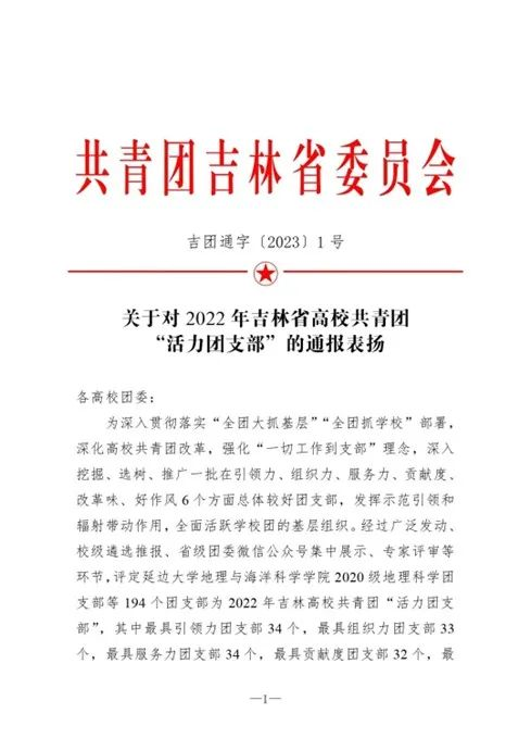 团委积极进取,探索创新,在2022年吉林高校共青团“活力团支部”评选中,我院190906团支部荣获“最具服务力团支部”称号。