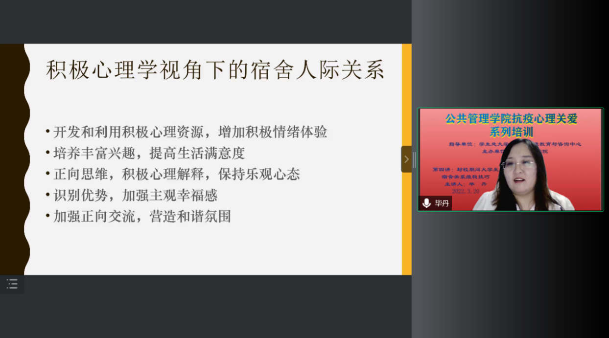 举办首轮抗疫心理关爱系列讲座第四讲。本次讲座以“封校期间大学生宿舍关系维稳技巧”为主题,主讲人是社会工作系的毕丹老师。