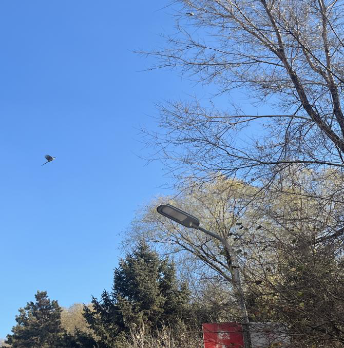 的秋天,蓝天铺底,疏枝轻晃,喜鹊振翅划破澄澈——这是校园里藏着的秋日小生动。