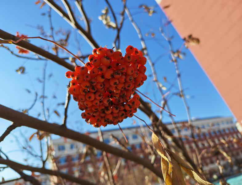 深秋枝叶渐稀,花楸却以一簇红意点亮寒色。凋零中仍有生机,在校园的静蓝天空下,秋日的坚韧与温暖悄然盛放。